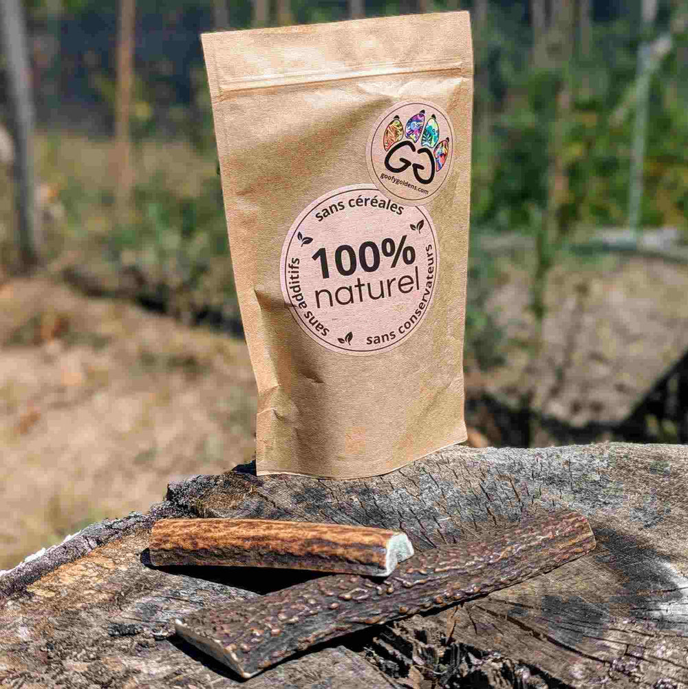 Chez Goofy Goldens, nous croyons en la simplicité et la pureté des produits. Nos bois de cerf fendus sont 100% naturels , sans additifs ni conservateurs. C'est le jouet résistant, 100% naturel et végétal par excellence.