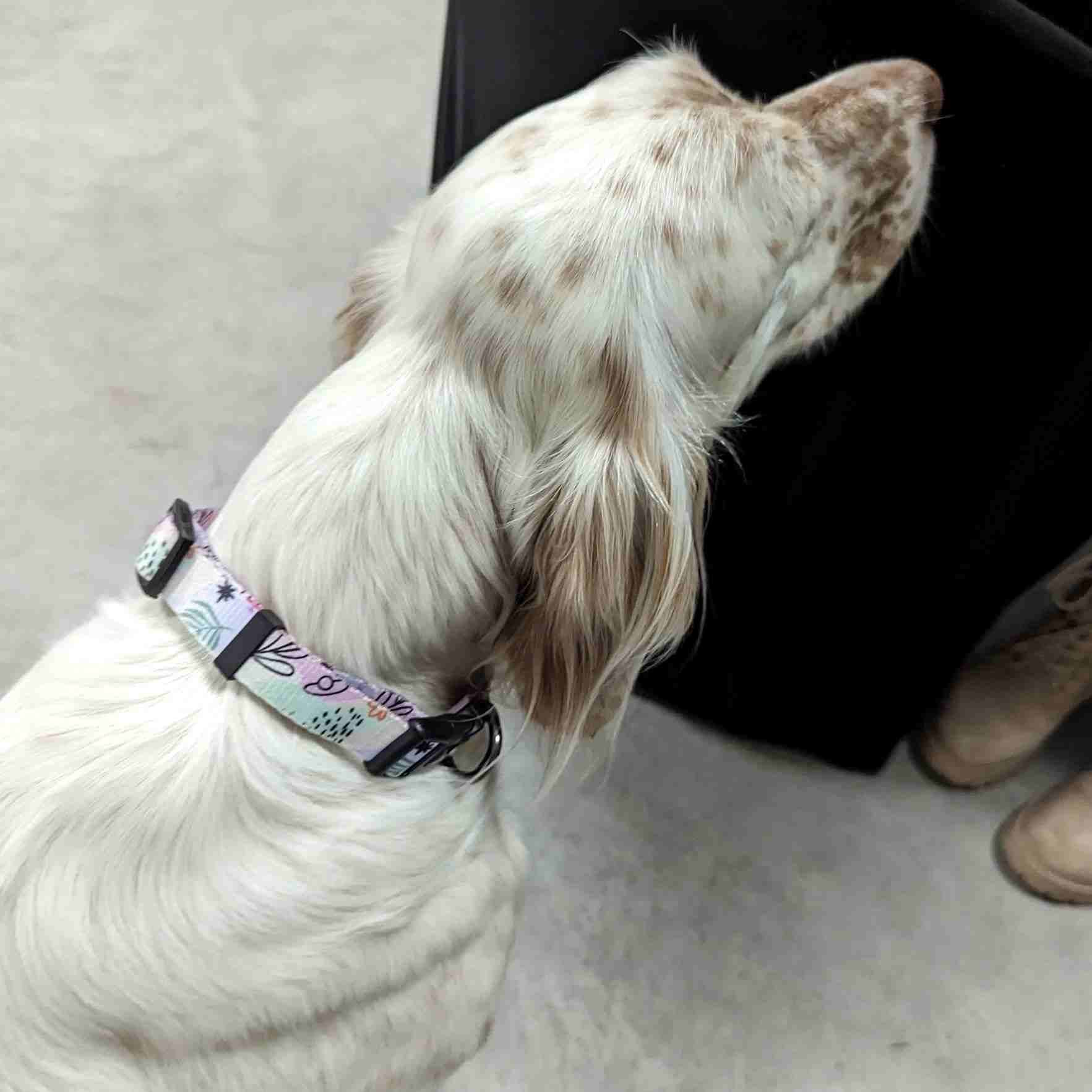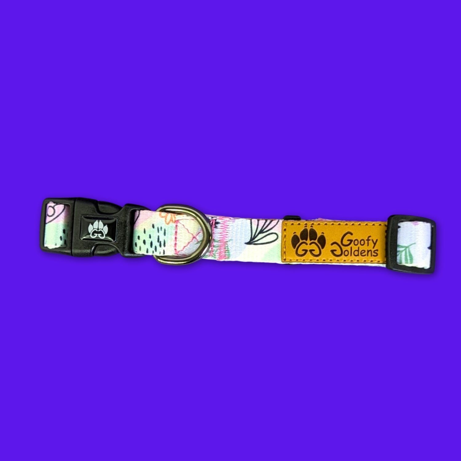 Collier pour chien Pastel de la marque Goofy Goldens. Présenté de face pour mettre en avant la boucle et l'anneau solides