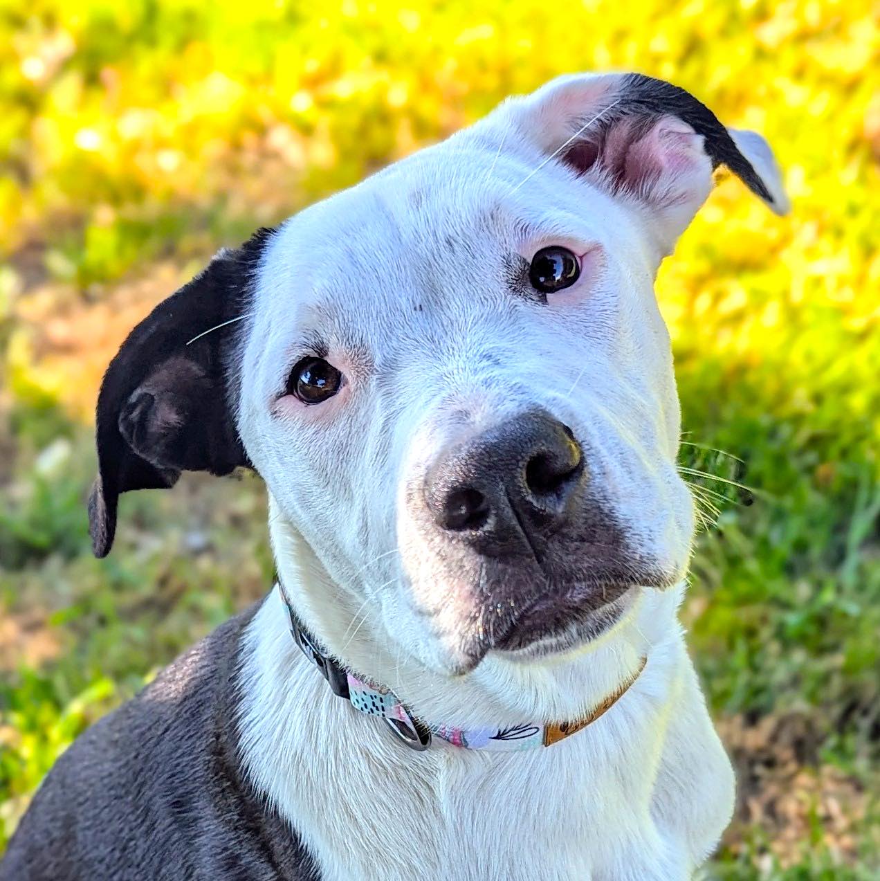 Chien de chasse blanc tacheté marron portant un collier aux couleurs pastel rose, bleu et vert