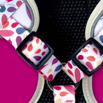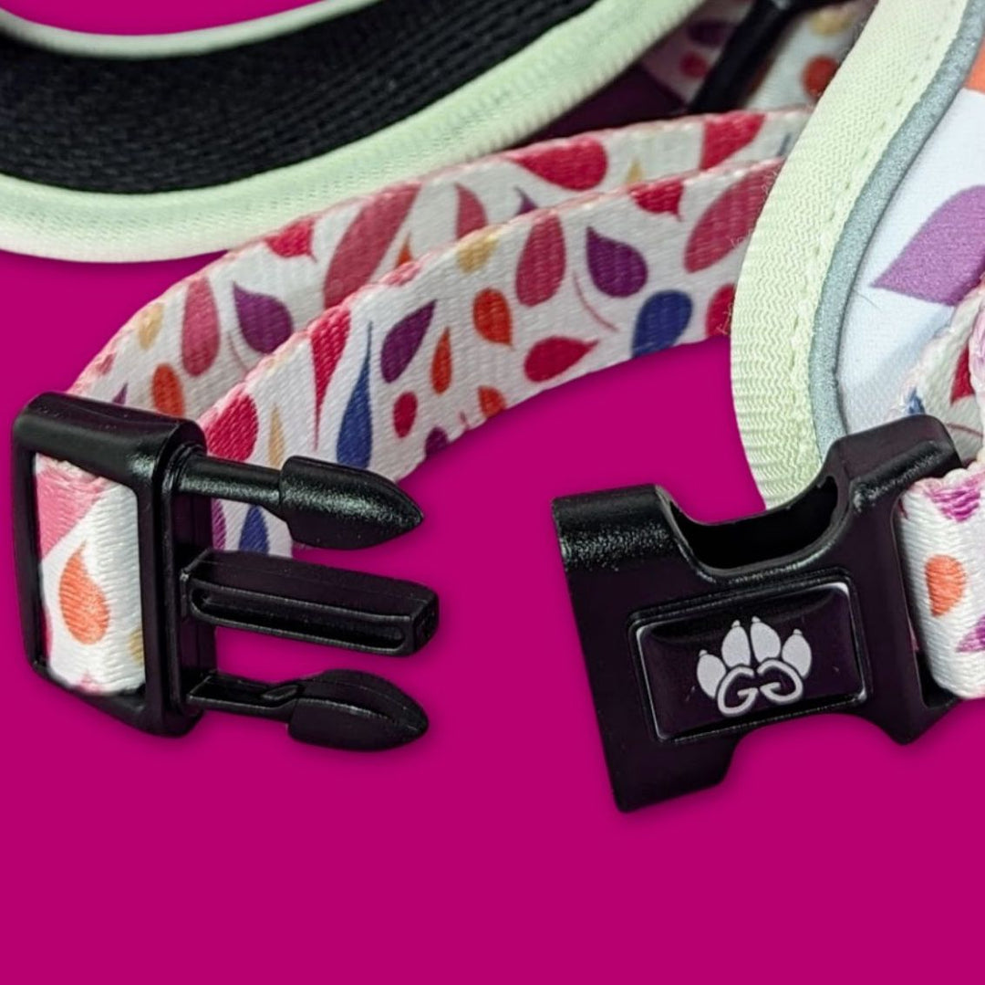 Harnais solide et tendance pour chien aux motifs en forme de pétale de couleur bleue, jaune, orange, rose, pourpre et violet de la marque Goofy Goldens.