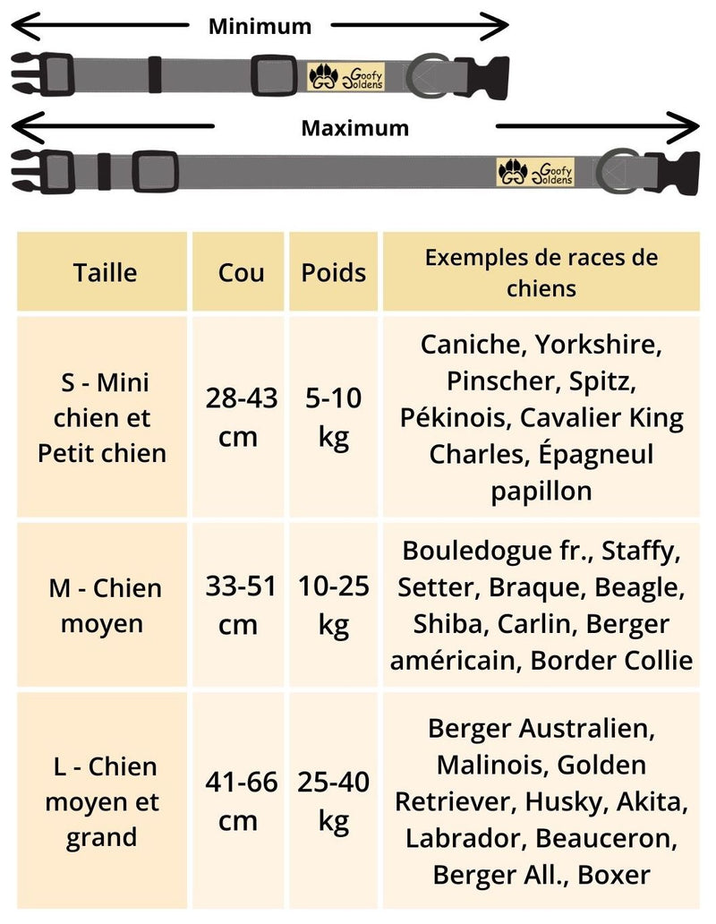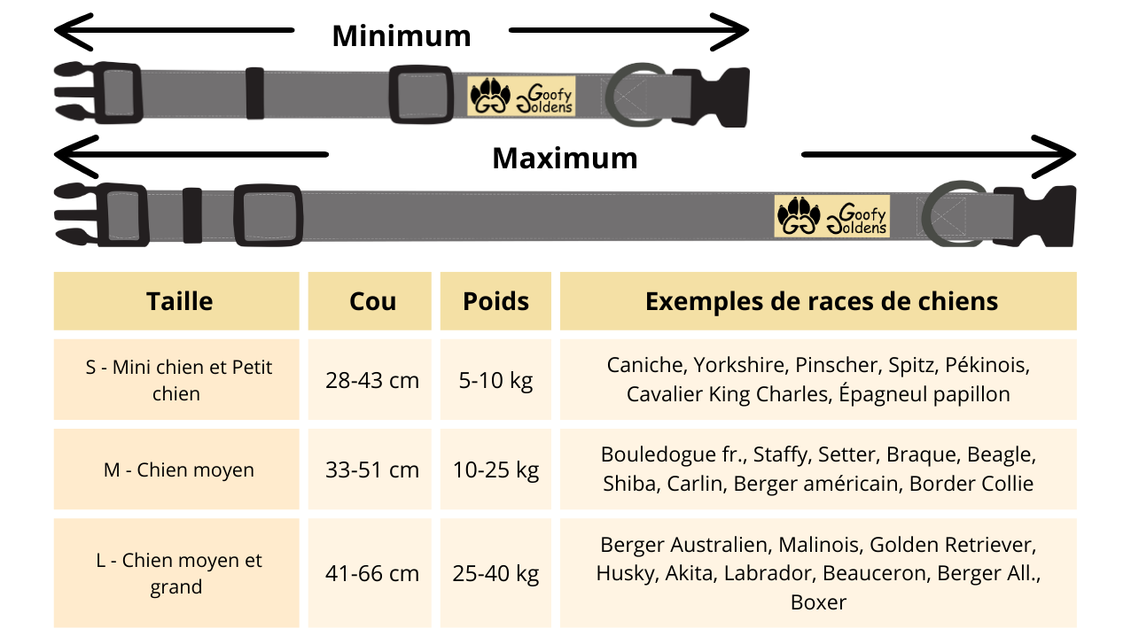 - Taille du collier : 28-43cm, largeur 1,5cm (S), 33-51cm, largeur 2cm (M) ou 41-66cm, largeur 2,5cm (L).