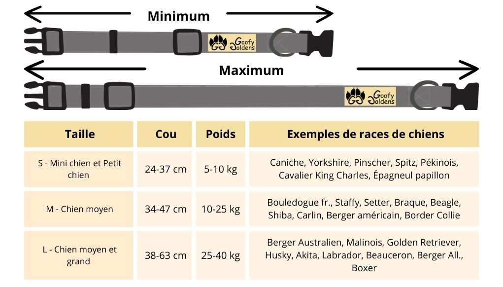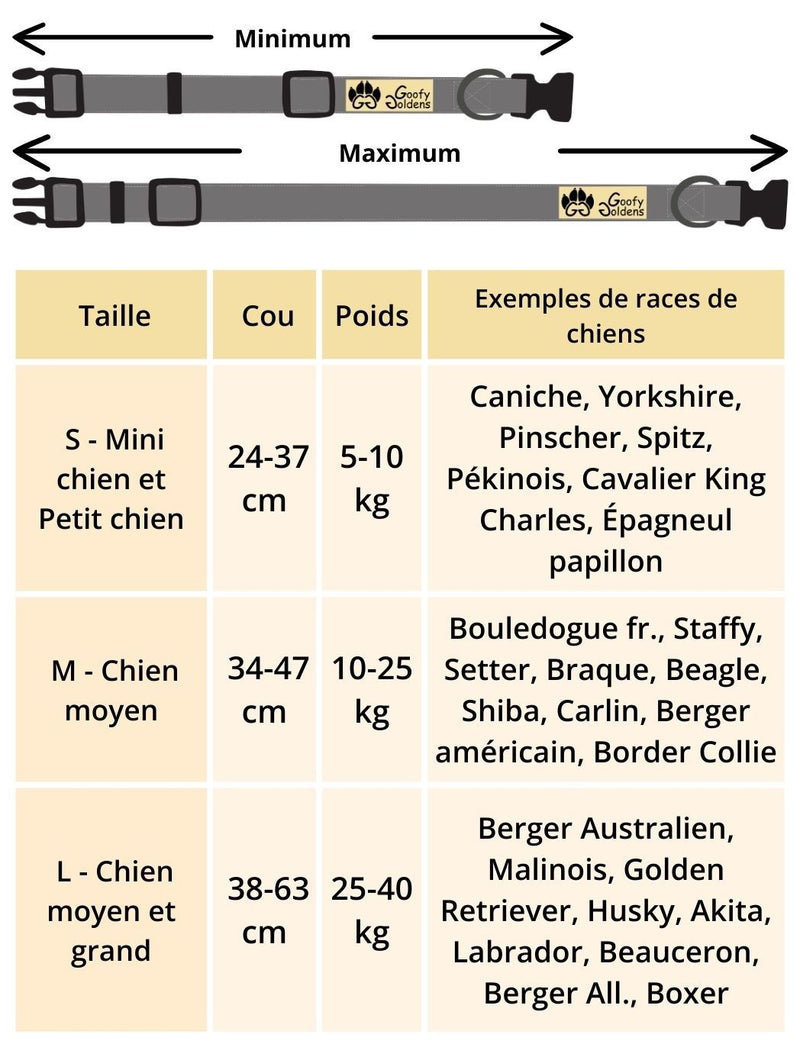 - Taille du collier : 24-37cm, largeur 2cm (S), 34-47cm, largeur 2,5cm (M) ou 38-63cm, largeur 2,5cm (L).