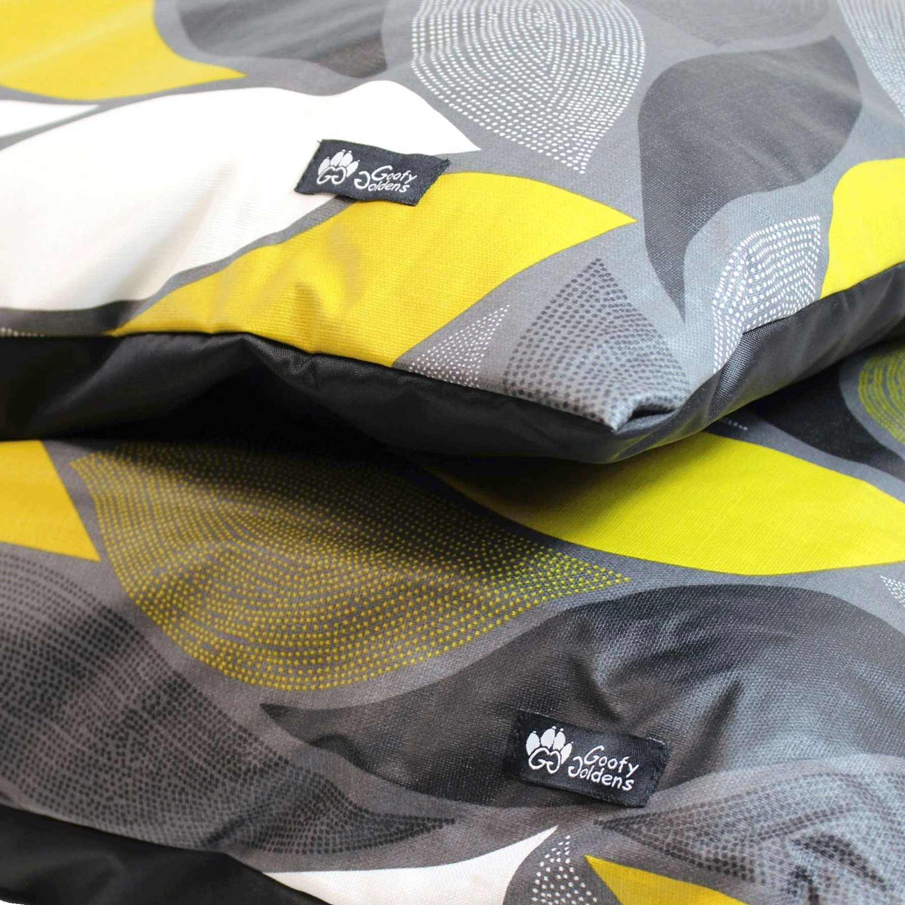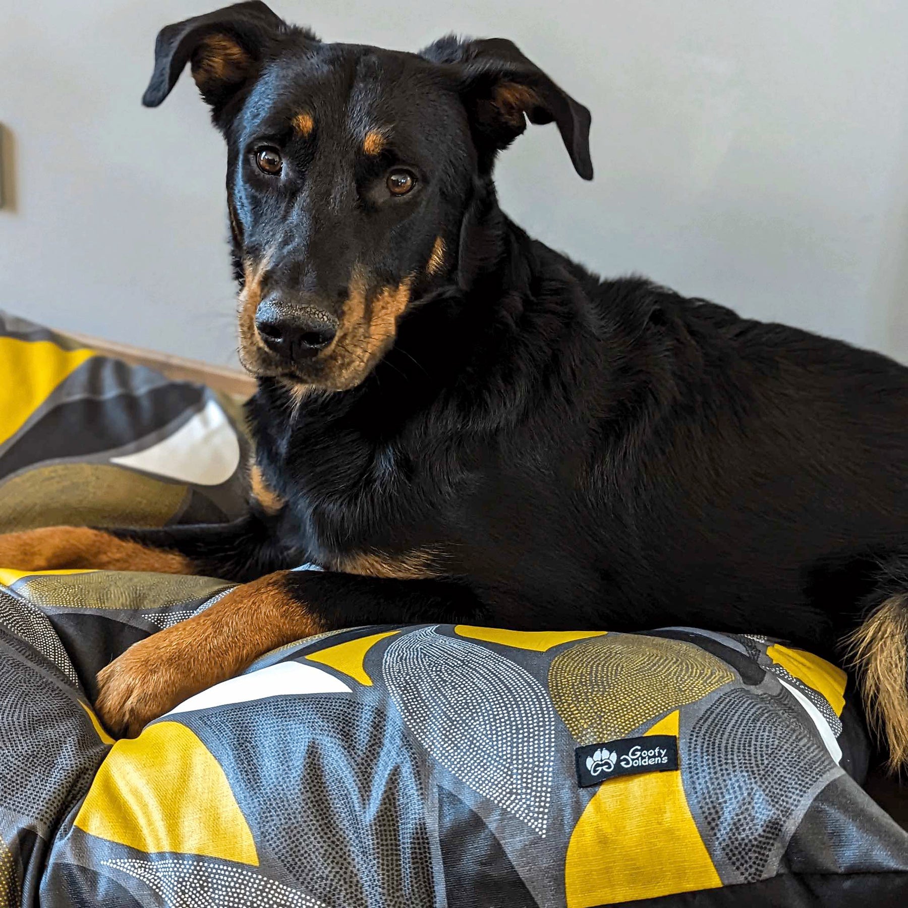 Le coussin Elégant aux couleurs jaune, grise et noire conviendra à toutes les décorations et à tous les chiens!