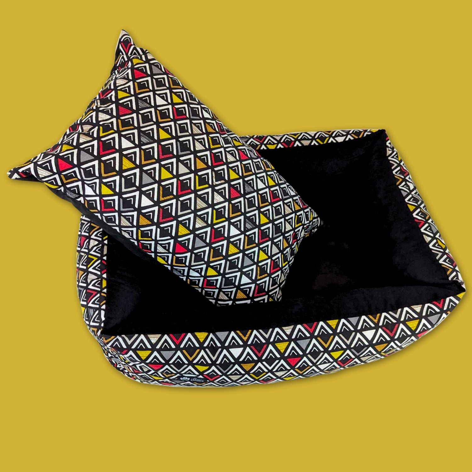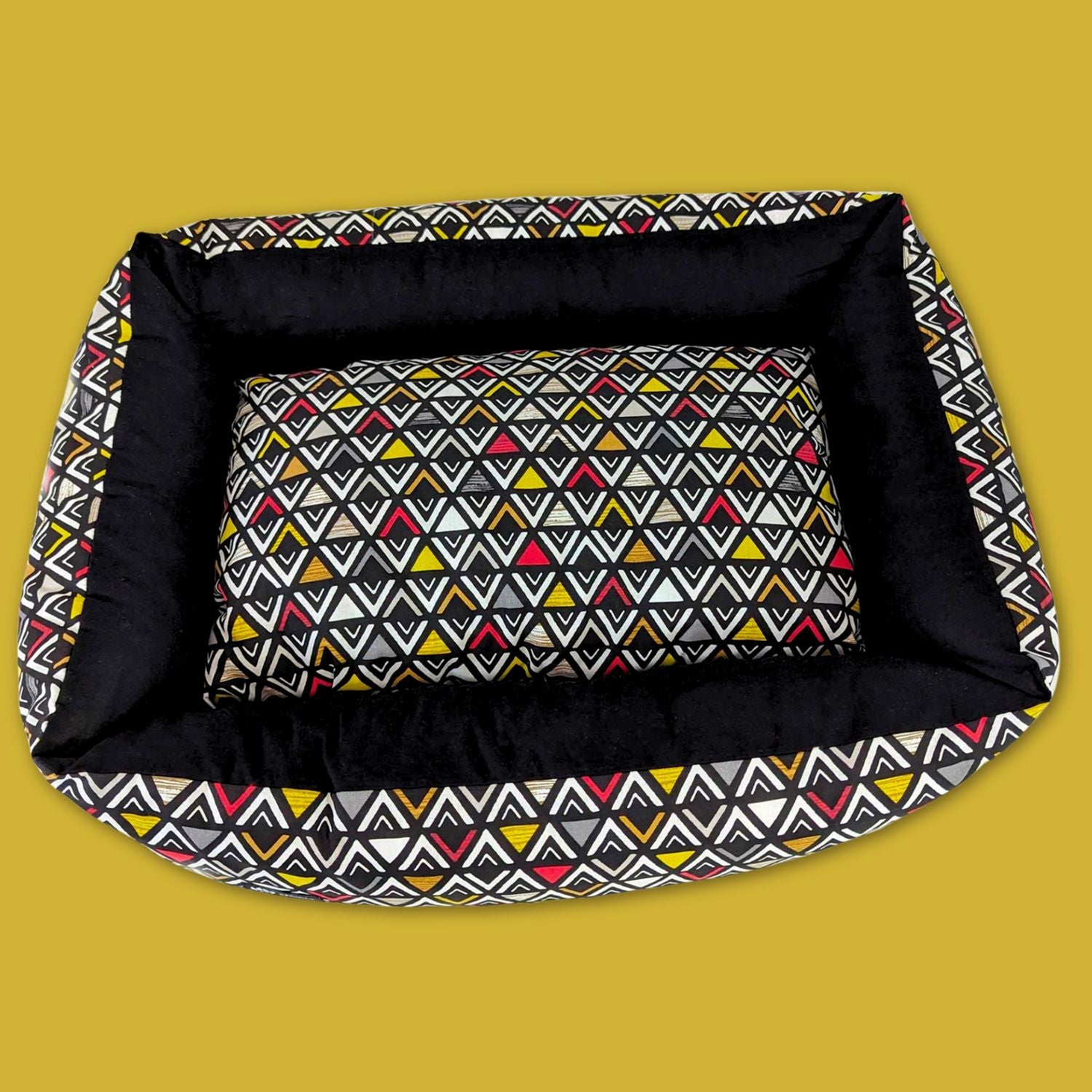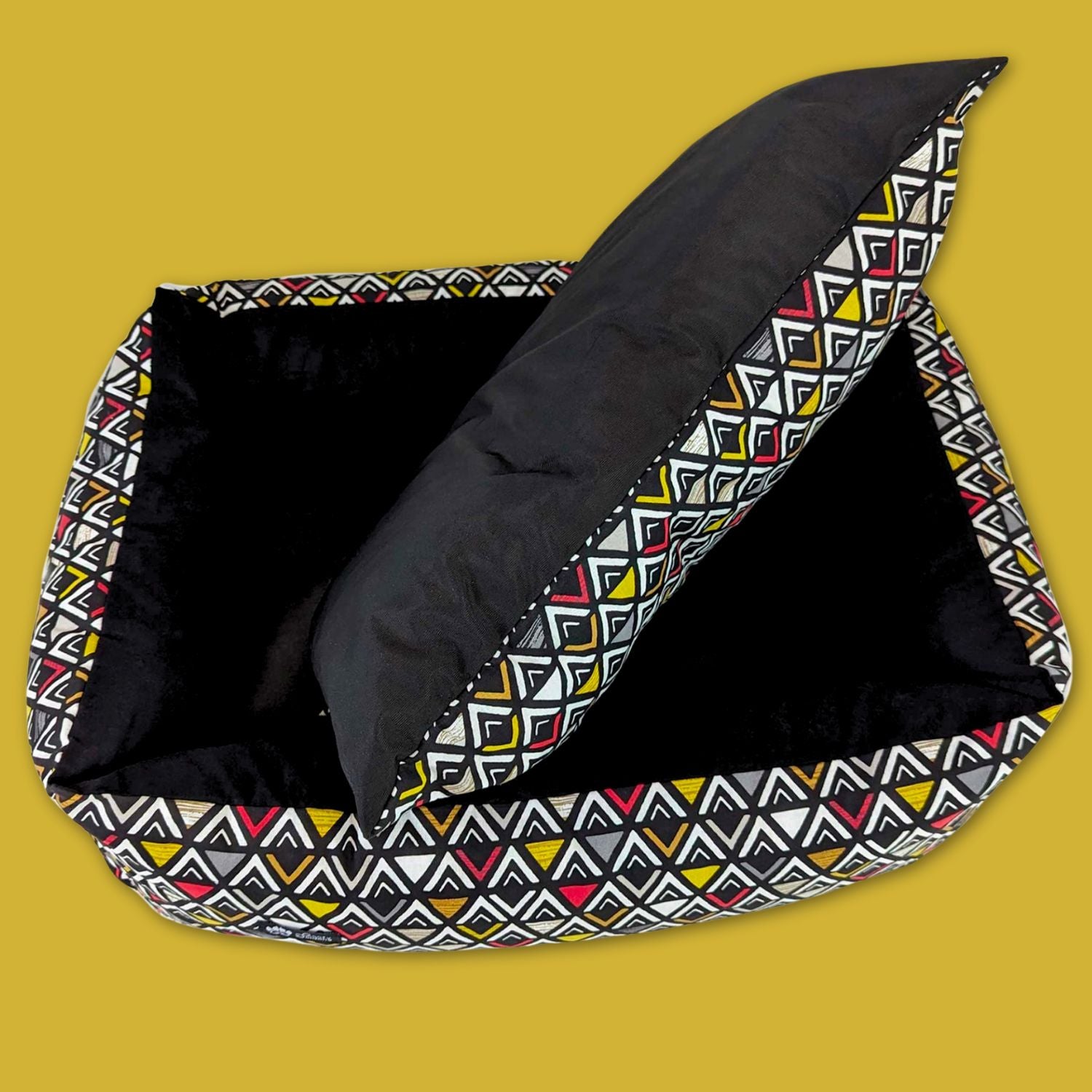 Panier pour chien motif Aztèque aux formes géométriques rouge, orange et jaune.
