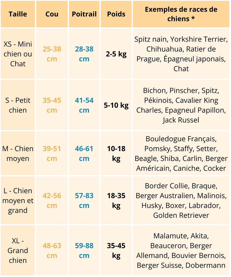 *Les races de chiens sont à titre indicatif. Parfois, pour une même race, certains mâles vont être dans une catégorie quand la femelle sera dans une autre. Aussi, si votre chien est un toutou bien en chair qui termine votre assiette, alors nous vous conseillons de remesurer son tour de cou et surtout son poitrail pour choisir la taille adaptée...