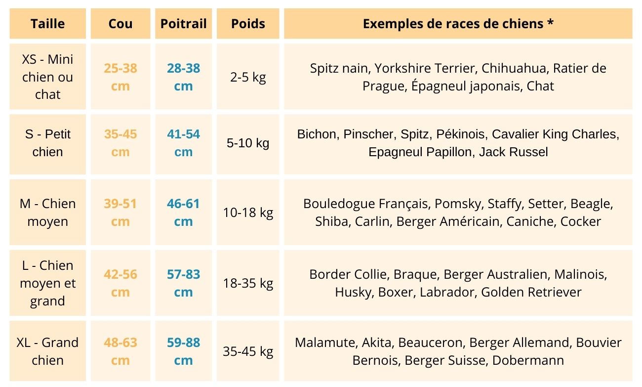Les « races de chiens » sont à titre indicatif. Si votre chien est un toutou bien en chair qui termine votre assiette, alors nous vous conseillons de remesurer son tour de cou et surtout son poitrail… pour choisir la taille adaptée.
