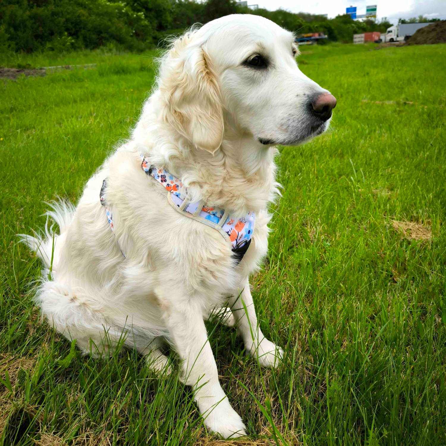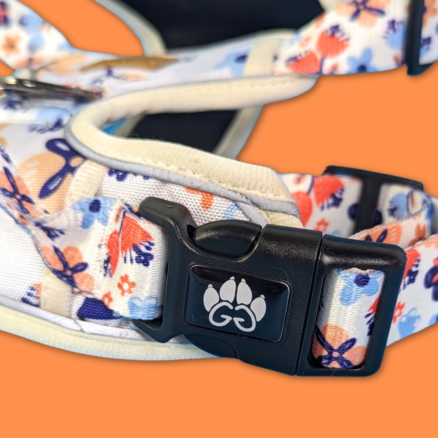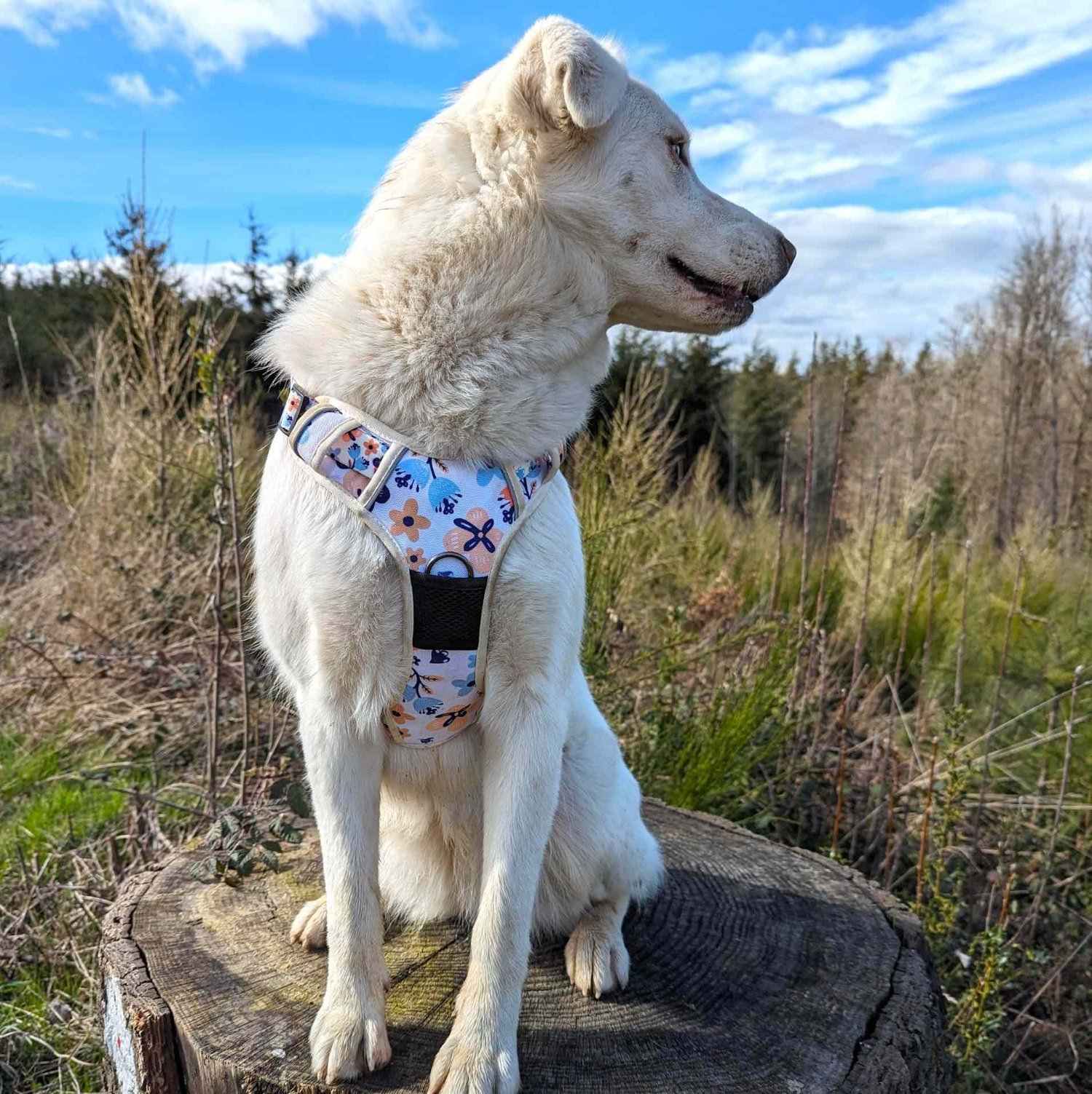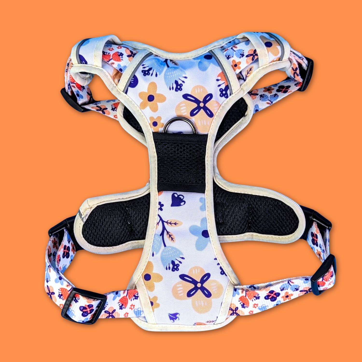 - Couleurs : fleurs printanières aux nuances de tons bleus et oranges sur fond blanc. L a disposition des motifs des harnais varie en fonction de la découpe du produit. Ainsi, chaque produit est unique.