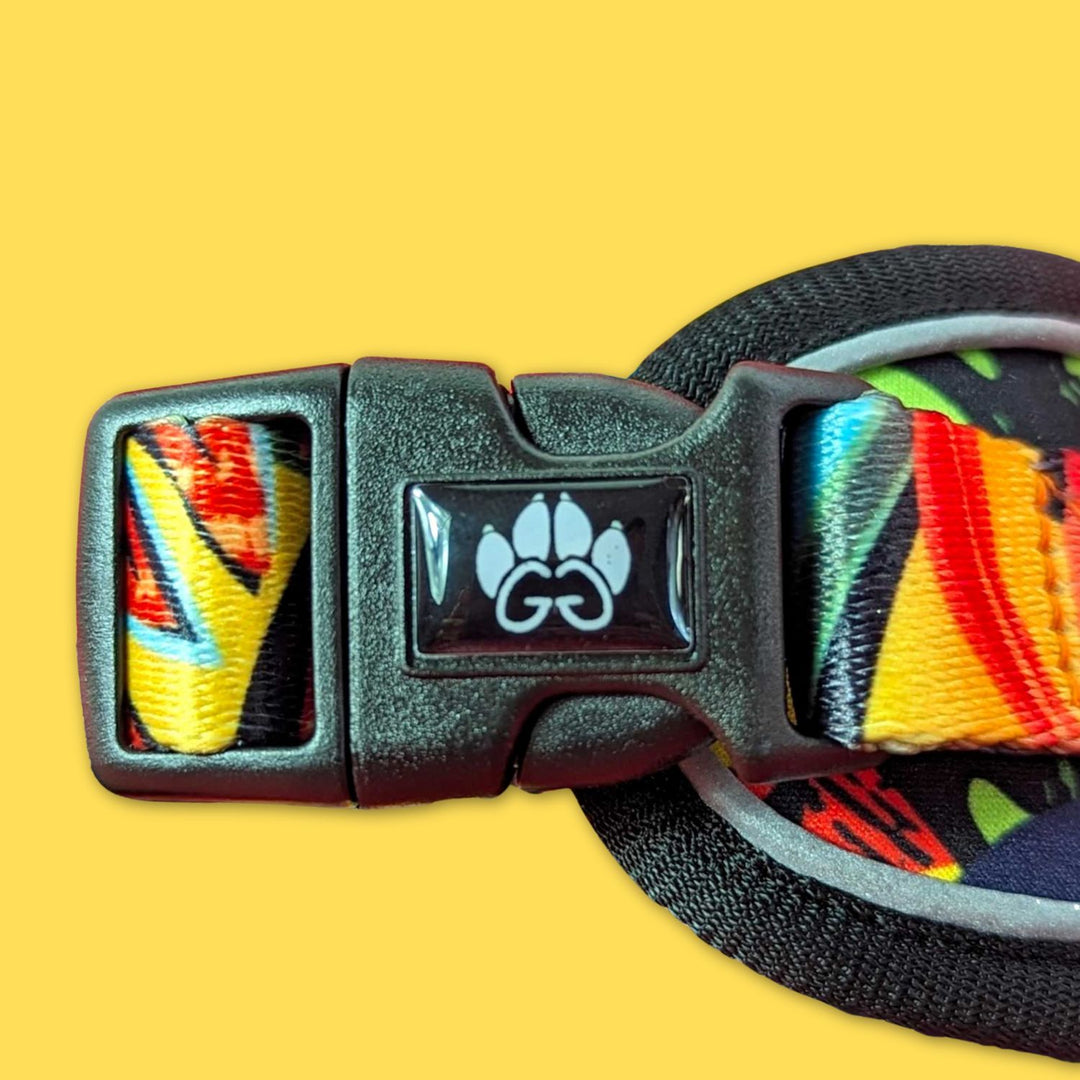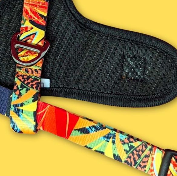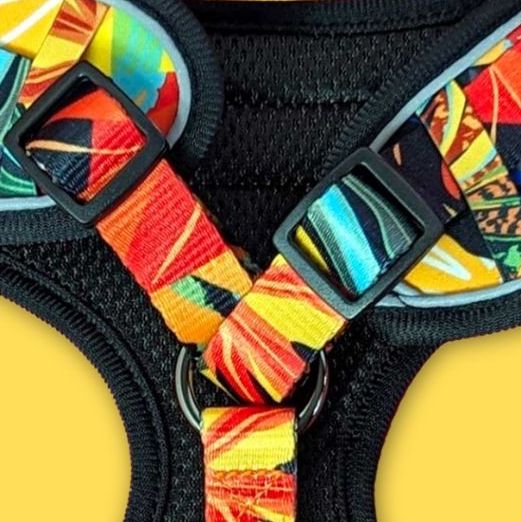 - Notre harnais en sangles de polyester est durable, confortable et respirant grâce à son rembourrage en néoprène imprimé et mailles respirantes. L' anneau en alliage en D à l'arrière apporte durabilité et robustesse et pour plus de sécurité et de visibilité, nos harnais pour chiens sont munis de bandes réfléchissantes .