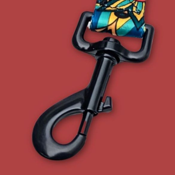 Pour une attache sécurisé et rapide, cette laisse est munie d'un mousqueton métallique noir pivotant à ressort résistant