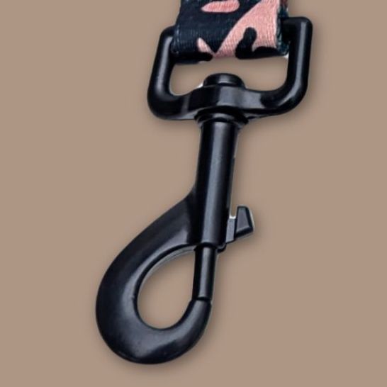 Pour une attache rapide et sûre, cette laisse a un mousqueton métallique noir pivotant à ressort très résistant