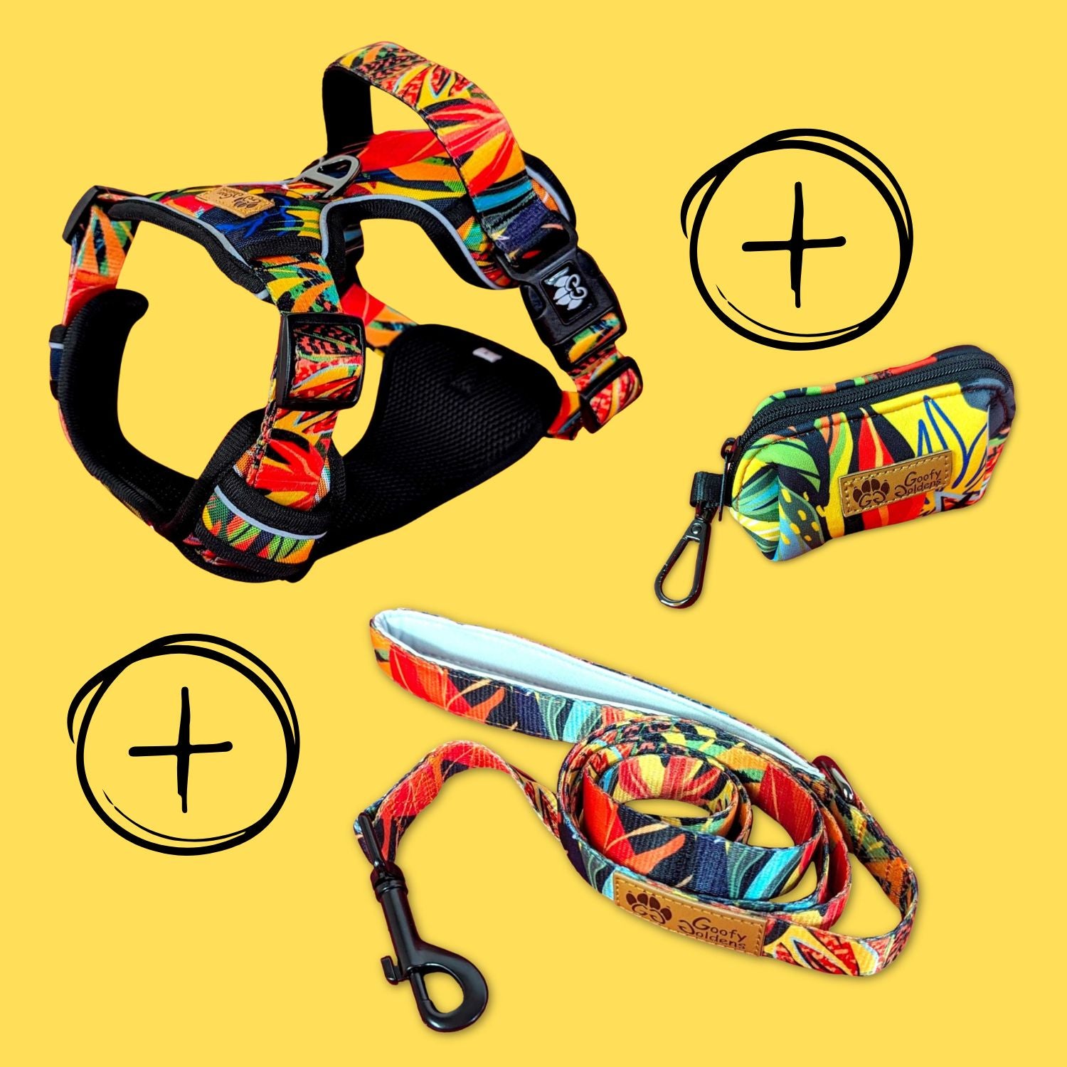 A dog walking kit with anti-pull harness to discover the colorful and exotic world of our Tropical collection.