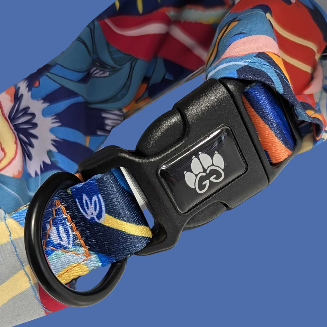 Lagoon range dog bandana with collar. This range is ultra trendy, the different mixes of blue, red, orange, yellow and black representing the richness and beauty of the lagoons are incredible and will make your dog the king of the neighborhood!