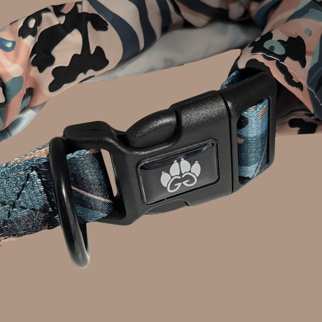 Savannah dog bandana with collar. This range is ultra-trendy, with different mixes of brown, green, and beige with foliage and leopard-spot patterns looking stunning and making your pooch the king of the neighborhood!