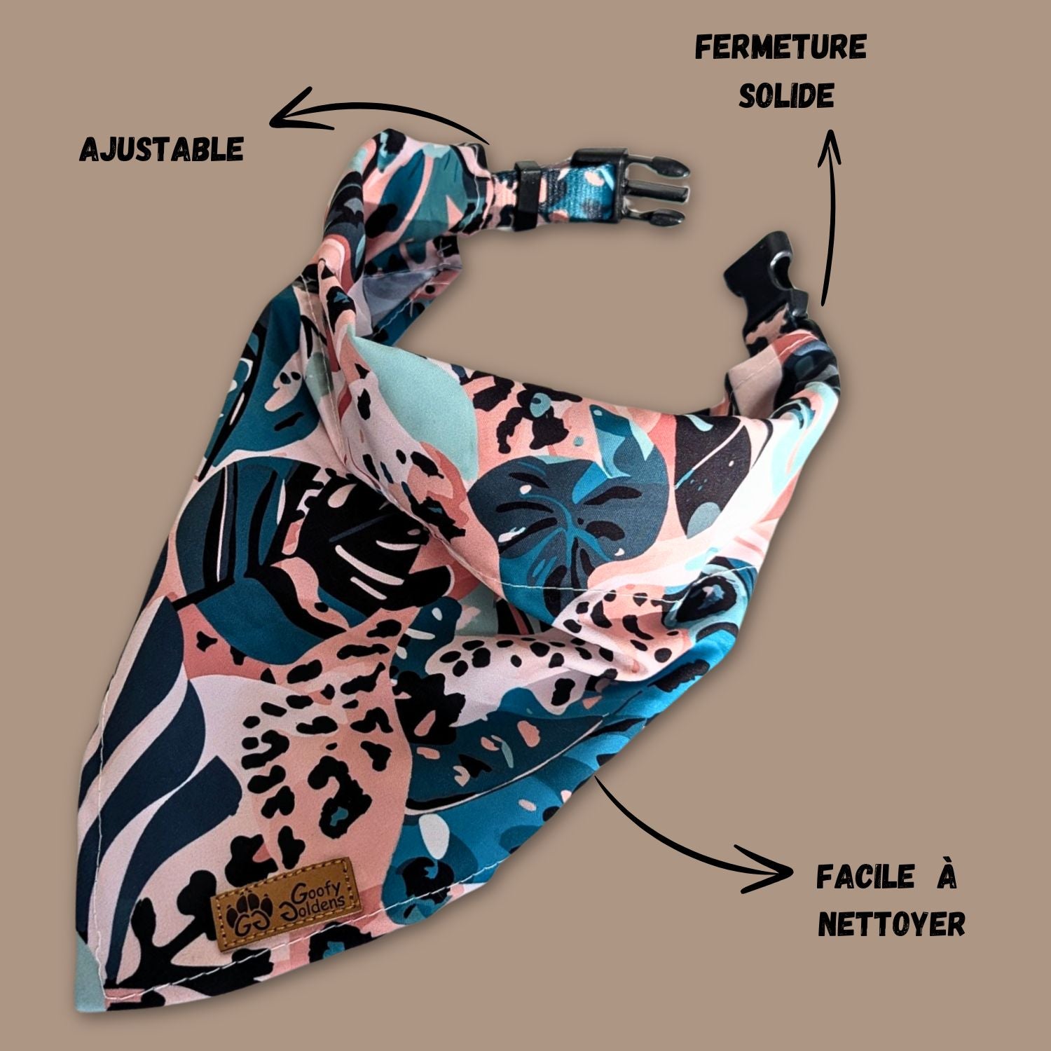 Savannah dog bandana with collar. This range is ultra-trendy, with different mixes of brown, green, and beige with foliage and leopard-spot patterns looking stunning and making your pooch the king of the neighborhood!