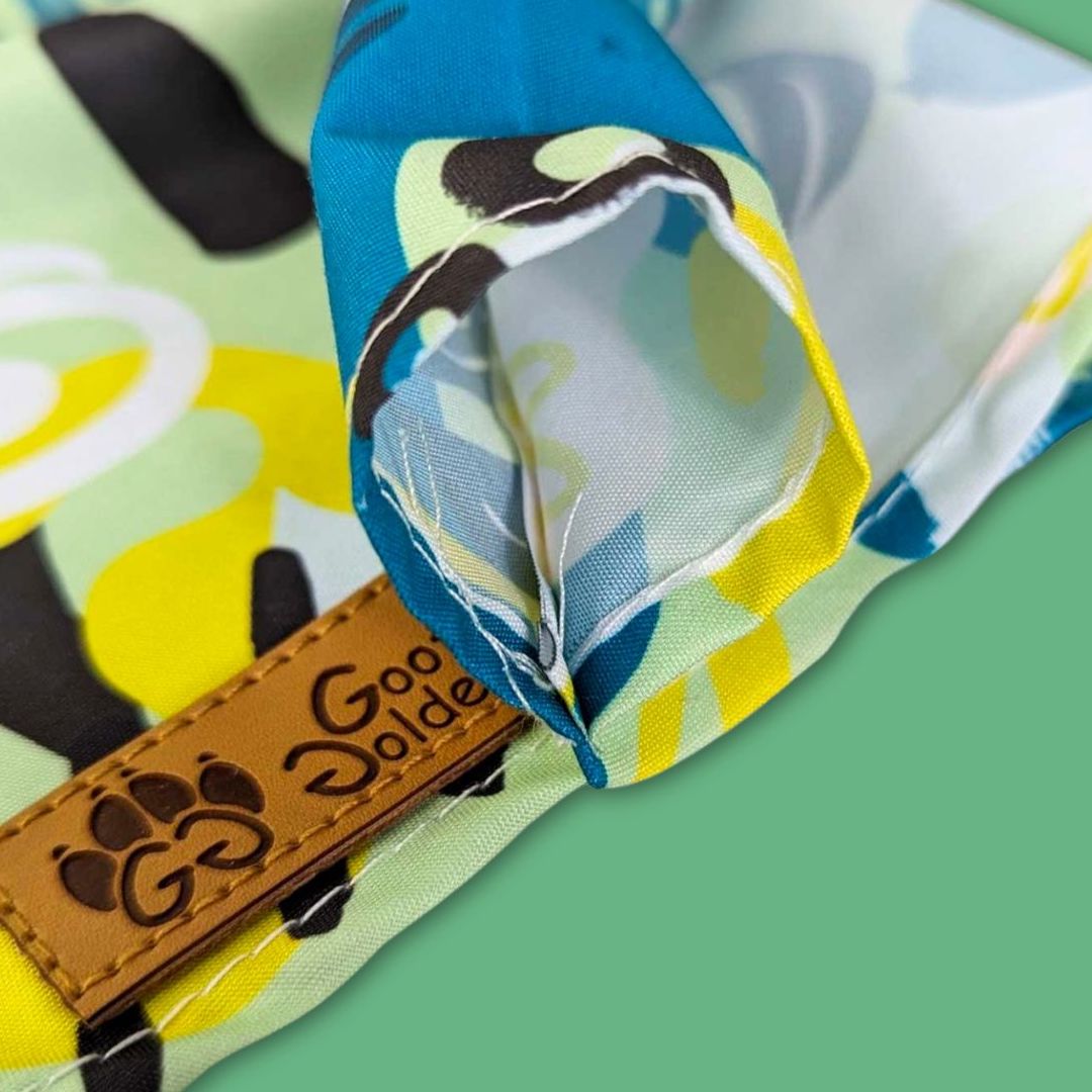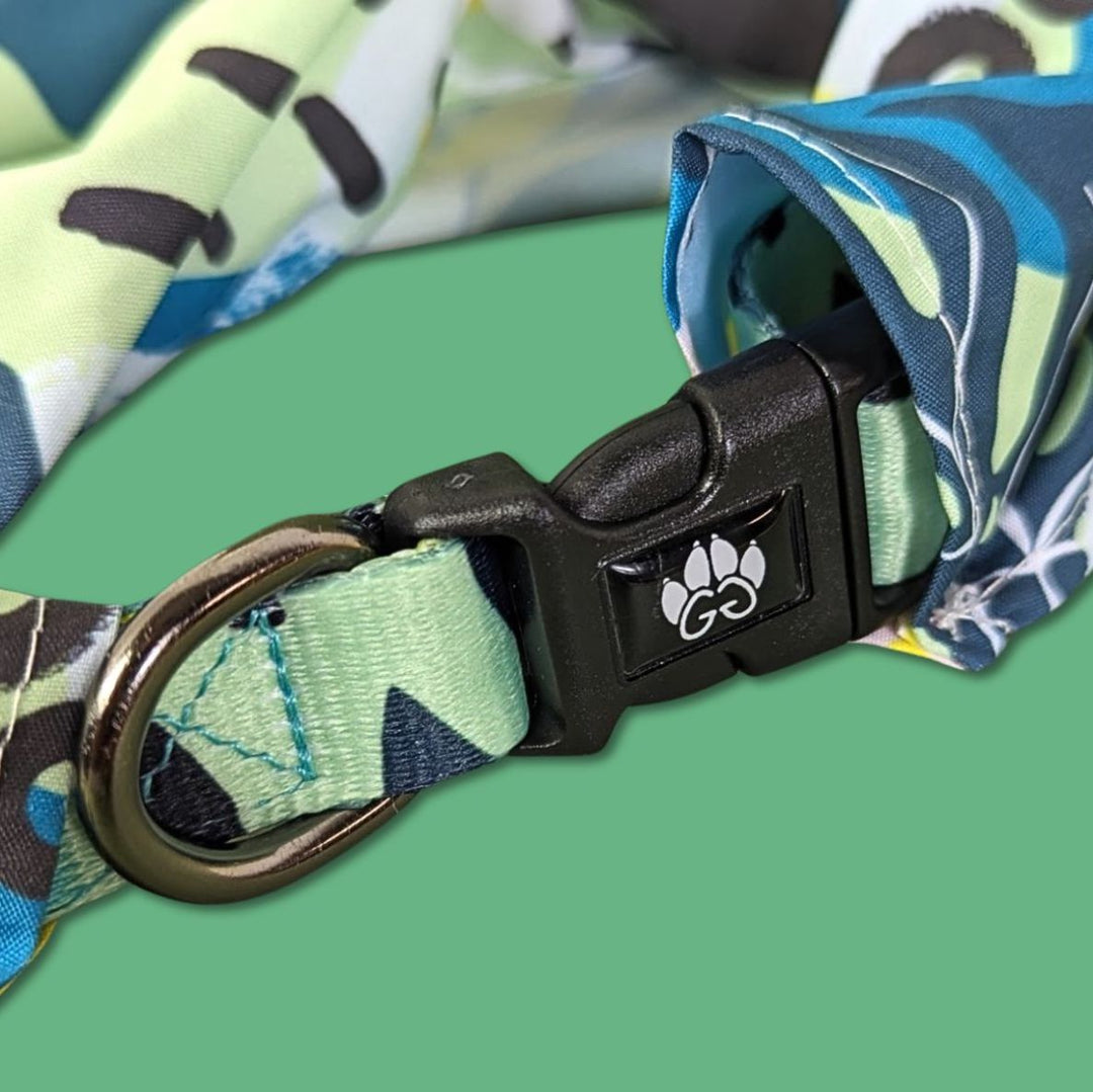 Reef range dog bandana with collar. This range is ultra pretty, the different mixes of yellow, green and black colors will leave you in awe of your dog!