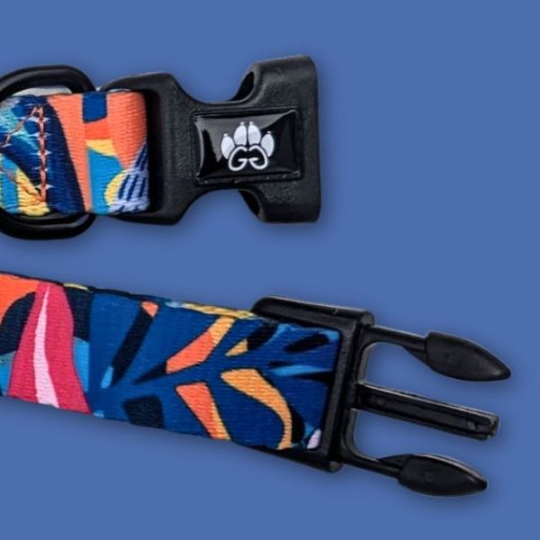 The Lagoon dog collar with its incredible colorful patterns on a blue background, reminiscent of the most beautiful lagoons in durable polyester is the perfect choice for owners wishing to combine comfort and safety for their pet. This durable dog collar is made from high-quality polyester , a material that is both robust and soft, guaranteeing optimal protection on a daily basis. Thanks to its printed design, this trendy collar adapts perfectly to the needs of active dogs, providing a pleasant and comfortable feeling around the neck of your four-legged friend.