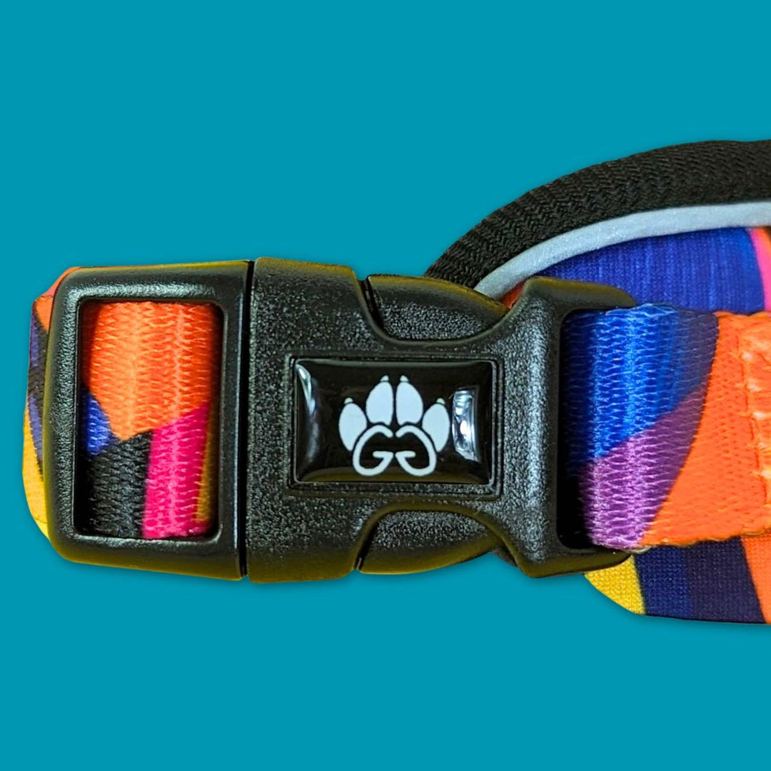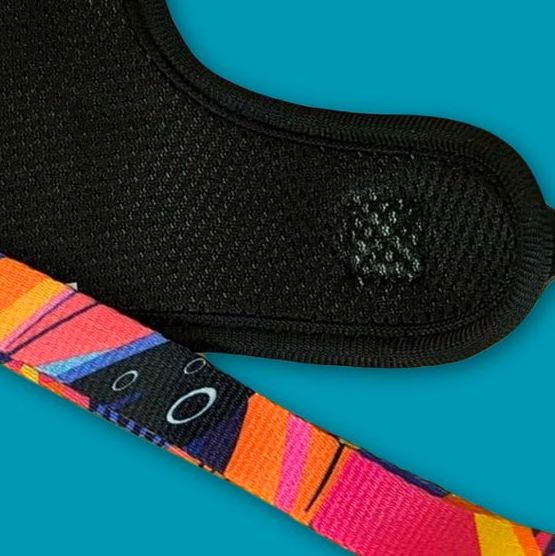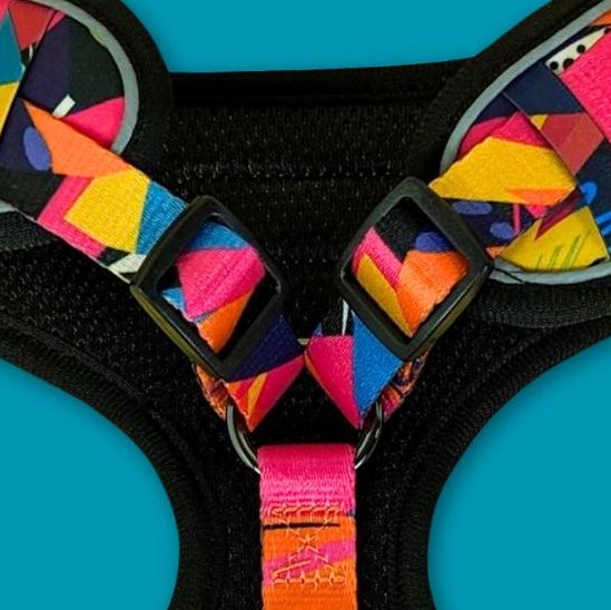- Our polyester webbing harness is durable, comfortable and breathable thanks to its printed neoprene padding and breathable mesh.