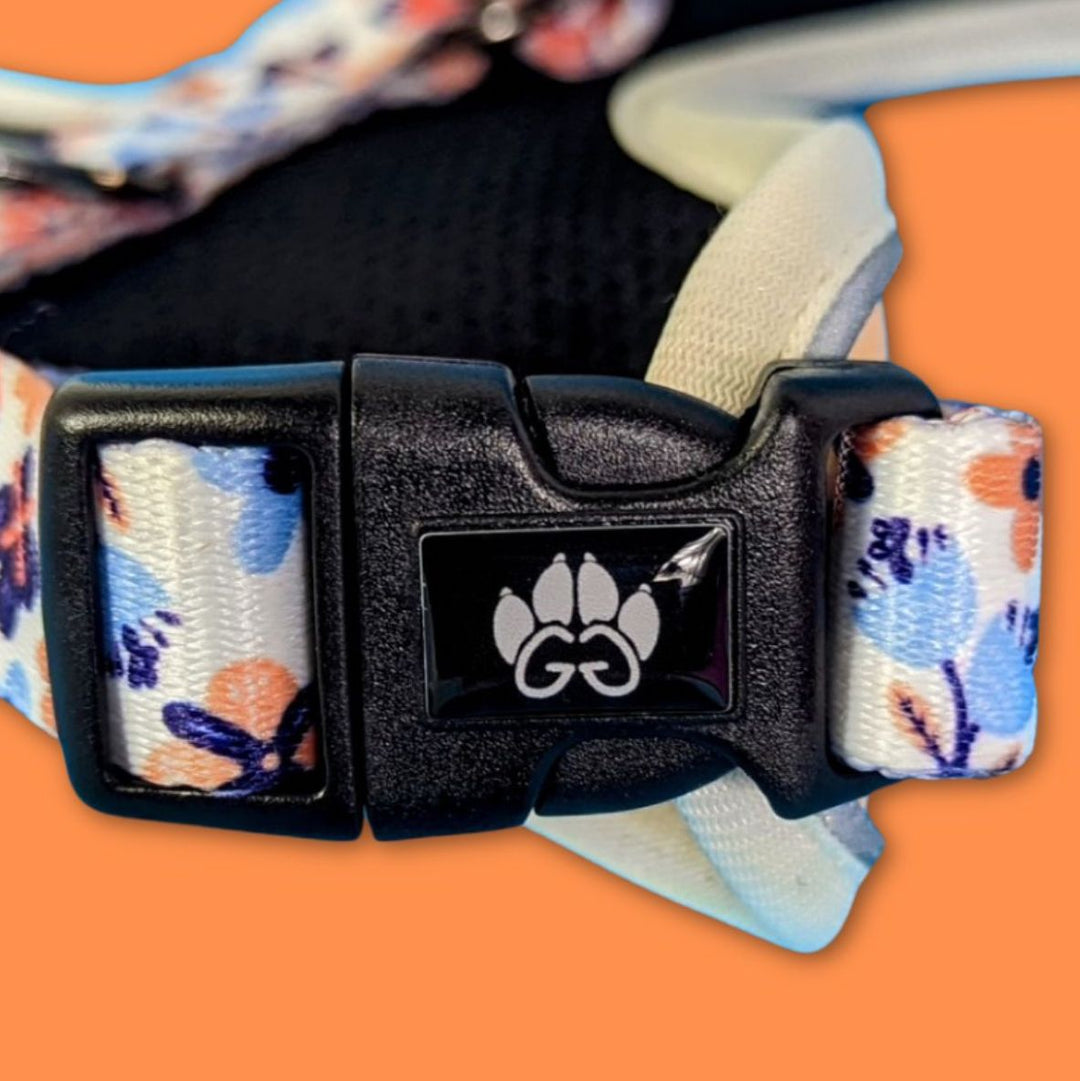 Harnais rembouré et confortable de la marque française Goofy Goldens aux motifs à fleurs tendances et colorés.