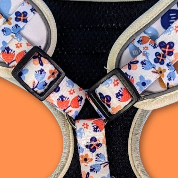 Harnais pour chien original aux motifs fleuris bleus, jaunes et orange de la marque Goofy Goldens.
