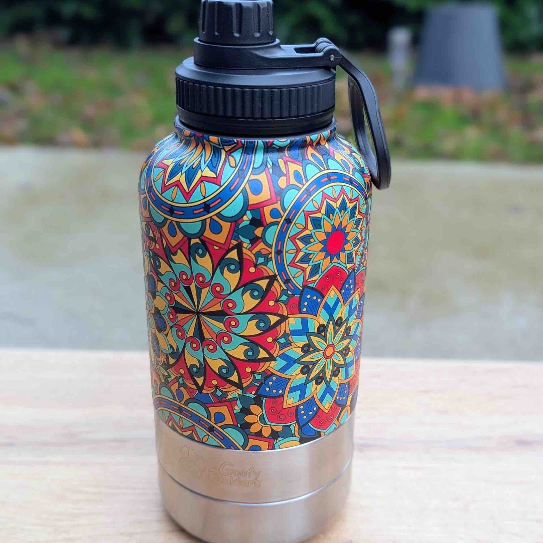The Goofy Goldens 3-in-1 water bottle was designed specifically for outings with your dog, whether it's a walk in the city, a hike, or a car ride. No more water bottles where the water gets warm after 15 minutes of walking, and no more plastic containers for feeding your dog: two integrated stainless steel bowls, a leak-proof reservoir, and a spout—everything is combined in one compact and stylish bottle.