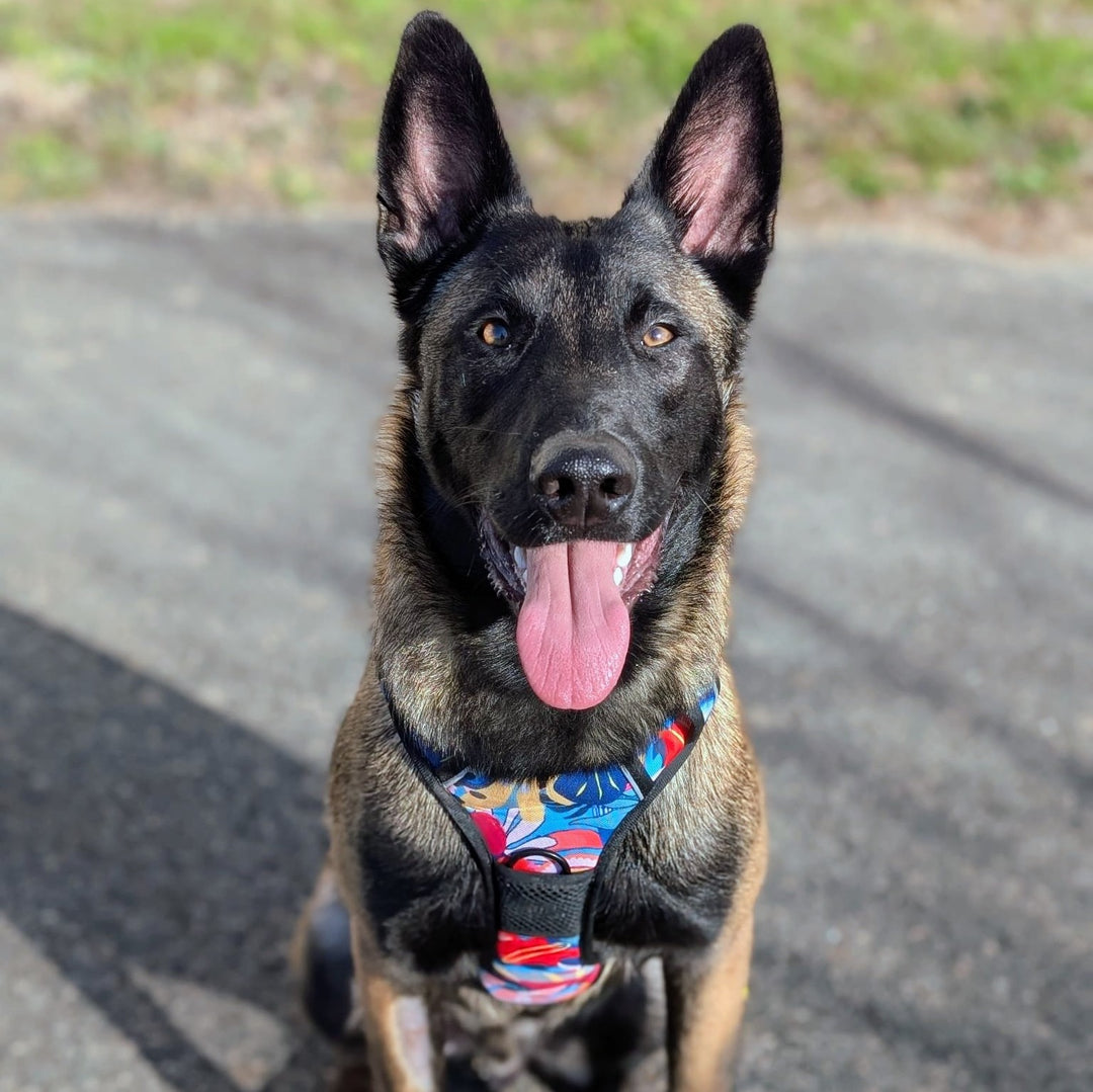 Arès is a Beauceron/Malinois mix that we rescued from abuse when he was one year old. He was tied outside to a post, night and day, without a kennel, without shelter. We don't know much more about his story, except that he can't stand it when you have a stick in his hands... It took a few months to regain his trust. Unable to find a suitable family, we adopted him. Today, he's a big, loving dog who loves to play soccer, stand guard, and have fun with children. Our dad adopted him.